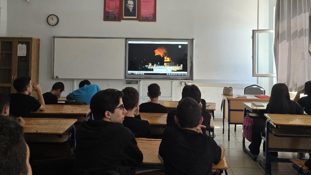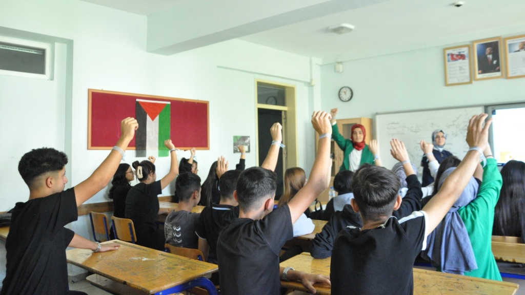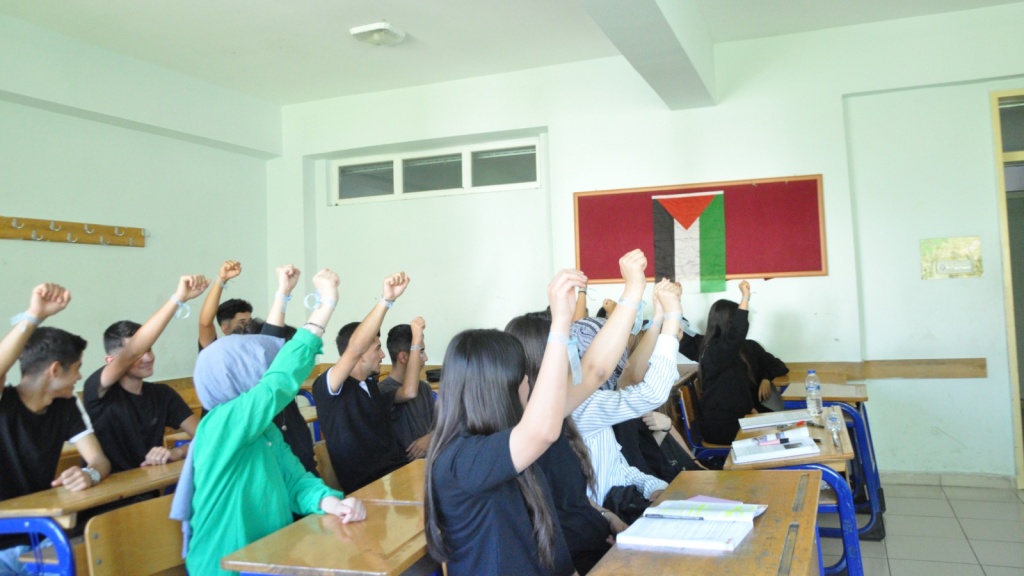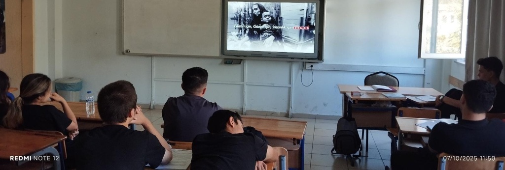 Sınıflarımızda çeşitli videolar ve sunular izlettik. Sumud filosuna ve Gazze'ye desteğin göstergesi mavi kurdeleleri bileklerimize bağladık.